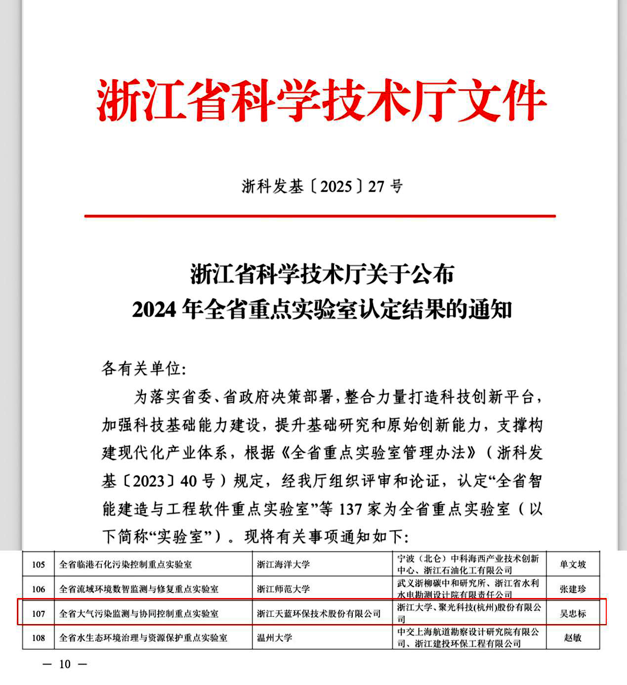 2025年6月4日,浙江省科技廳發(fā)布《浙江省科學(xué)技術(shù)廳關(guān)于公布2024 年全省重點(diǎn)實(shí)驗(yàn)室認(rèn)定結(jié)果的通知(浙科發(fā)基〔2025〕27號(hào))》,由浙江天藍(lán)環(huán)保技術(shù)股份有限公司牽頭,浙江大學(xué)和聚光科技(杭州)股份有限公司共建的“全省大氣污染監(jiān)測與協(xié)同控制重點(diǎn)實(shí)驗(yàn)室”獲批組建,成為全省環(huán)境領(lǐng)域唯一以企業(yè)牽頭建設(shè)的省級(jí)重點(diǎn)實(shí)驗(yàn)室